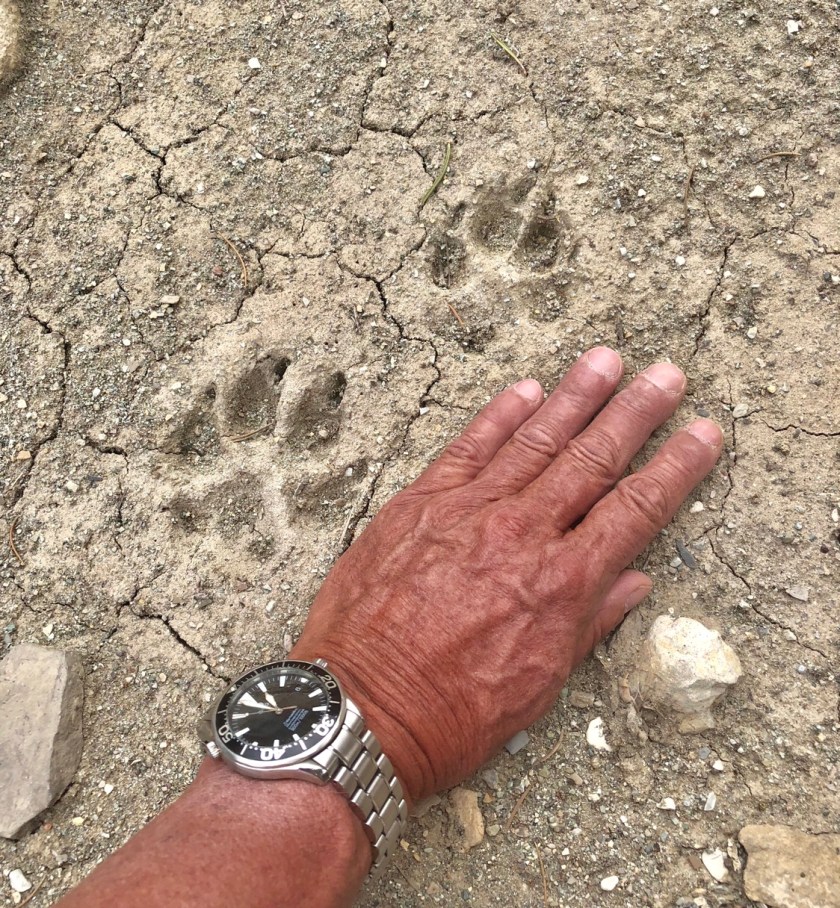 The Ranch sits on a valley floor at almost 6000 feet with the mountains looming thousands of feet above. The temperature dropped 20 degrees as we climbed up the trail. We stopped by a trickling creek and hiked up a small canyon looking for wildlife. The creek side mud was full of deer tracks ( Elk?) and other creatures, the animals obviously were attracted to the water. I started to notice other large imprints and realized I was standing over a complete set of cougar tracts. The four tracks were perfectly lined up showing the animals pace length, this was a BIG cat. The Rancher has complained to me about Cougars killing his calf’s. He said his brother had lost almost 50 new born lambs to cougars but added that eagles had grabbed many of them .