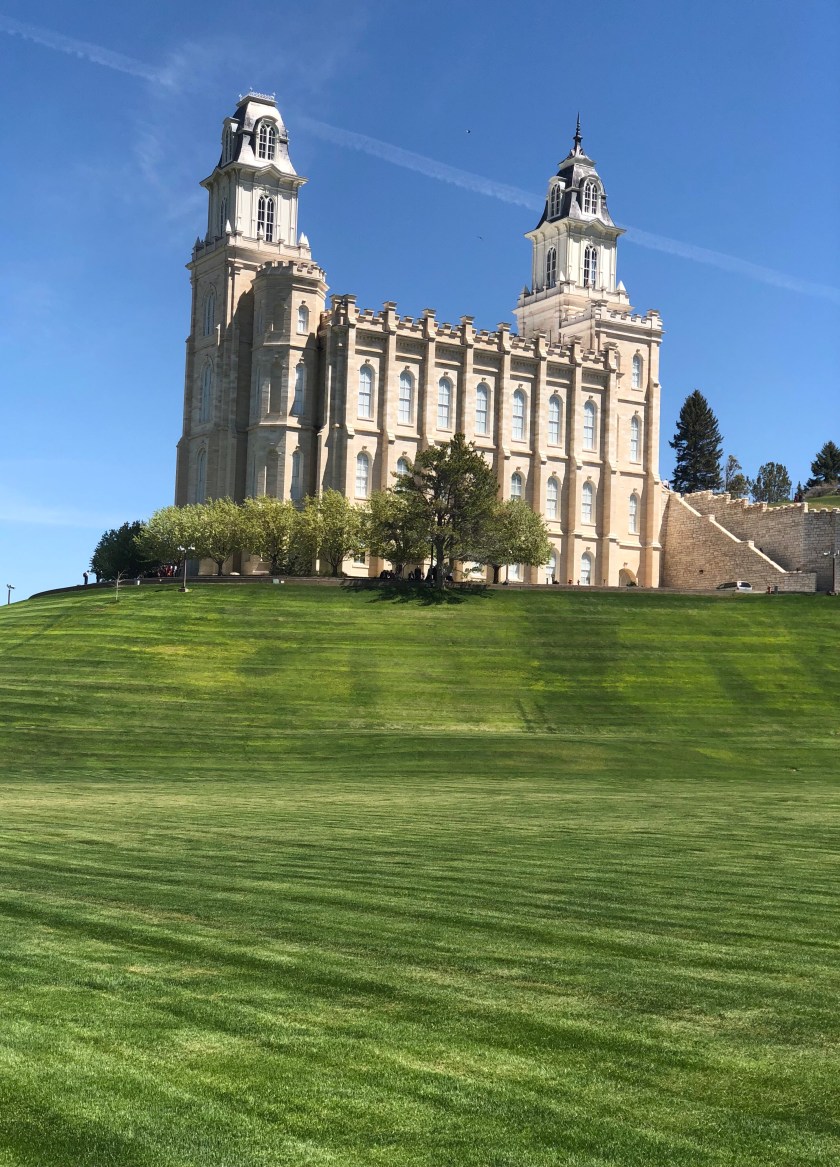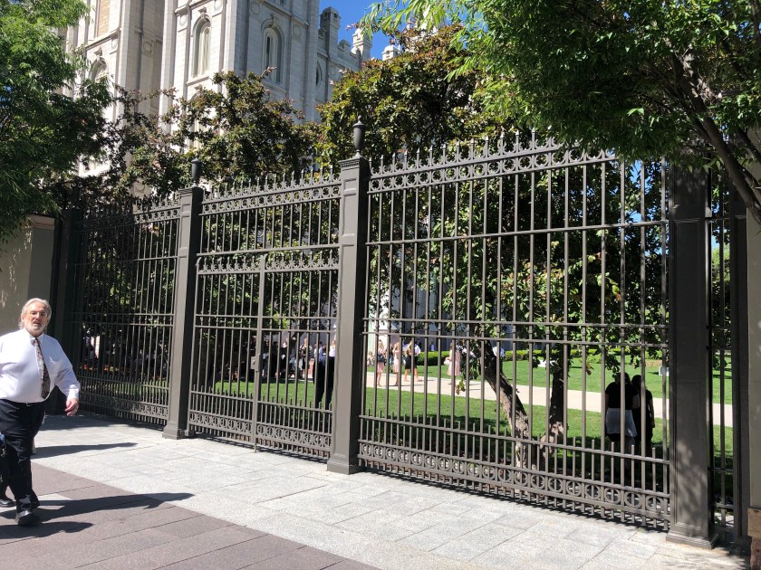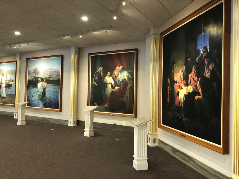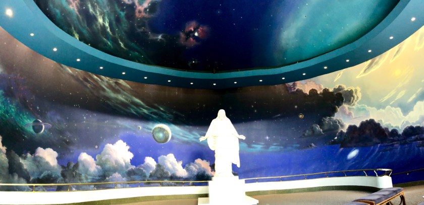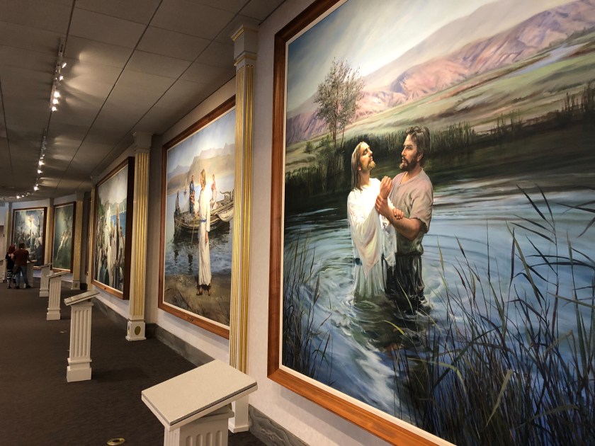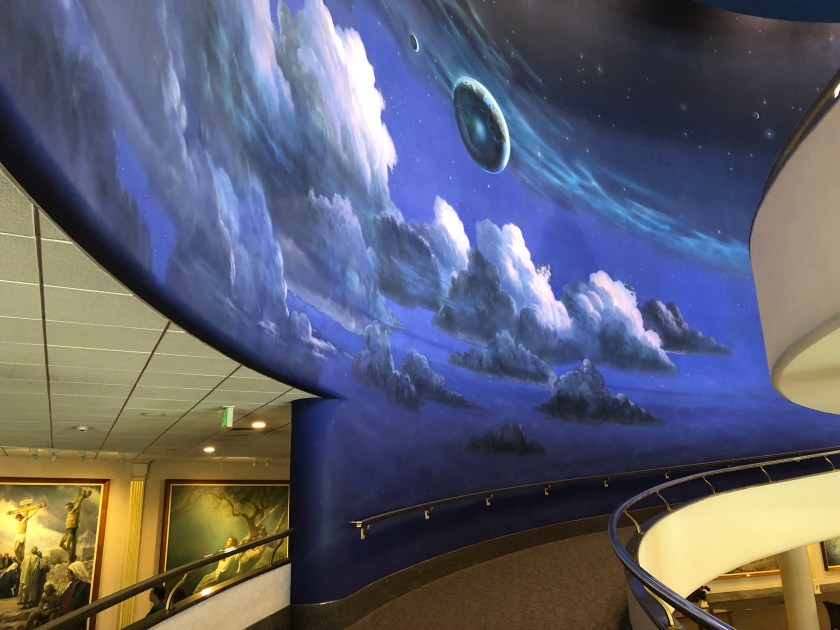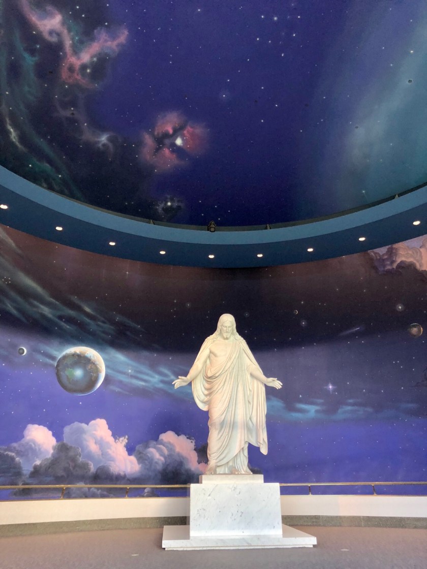 While in Salt Lake City, I visited Temple Square, the heart of the City and home of the Vatican like center of the Mormon Church. The impressive Temple sits amidst manicured gardens. Surrounding the MainTemple is the original first Church, various administrative offices and a palatial Visitors Center, all surrounded by a twelve foot stone wall with occasional beautiful iron gates. The visitors center’s vast 1st floor is lined with huge oil paintings depicting the pivotal moments in the blonde Jesus’s life. The paintings are quite well done and interesting. The upstairs is accessed by a huge sweeping circular staircase, actually a ramp. You approach the second floor amidst a flowing mammoth mural depicting the planets, flowing clouds, heaven like images, all backed up with beautiful celestial choir music singing, the kind of music I expect when I enter heaven . The beautiful heaven murals continue around amphitheater upstairs including the domed ceiling. A 15 foot marble statue of Jesus sits in the middle of the room, faced with 3 curved rows of cushioned benches set back on one side, a discreet viewing place. I sat there watching Chinese tourists line up in front of Jesus for Facebook photos. An odd scene. I later took a small group tour of the grounds provided by Volunteer Mormon Missionary young women completing their 18 month commitment. All very interesting.