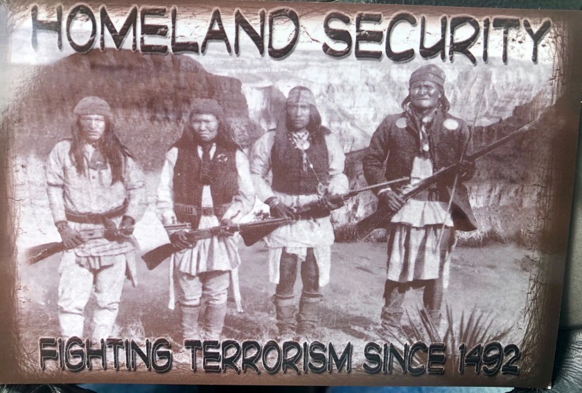 That being said, the Tribe has ended up with prime farm land and abundant game and Salmon on their ” Res “. It’s the most productive, beautiful Indian Reservation I’ve seen in America. While driving through, I stopped at a gas station and saw this Homeland Security post card, obviously tongue in cheek but still poignant. The firearms warning was at a Tribal controlled rest area. (