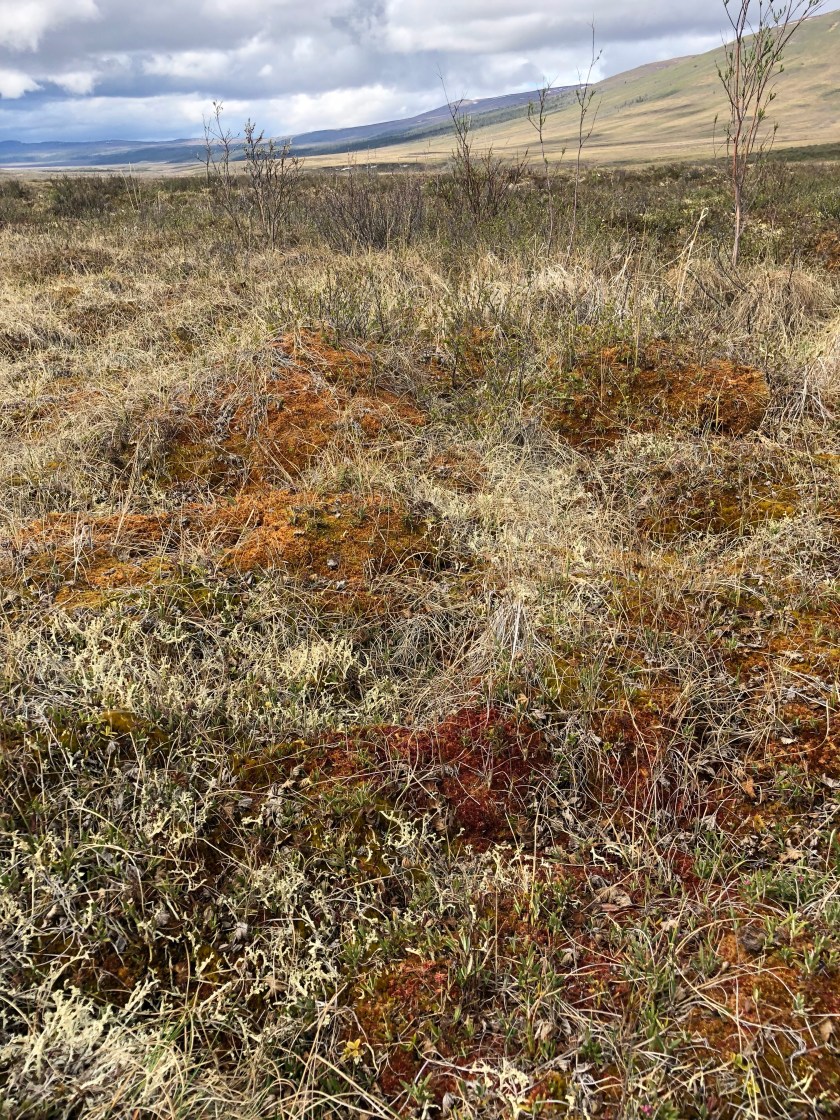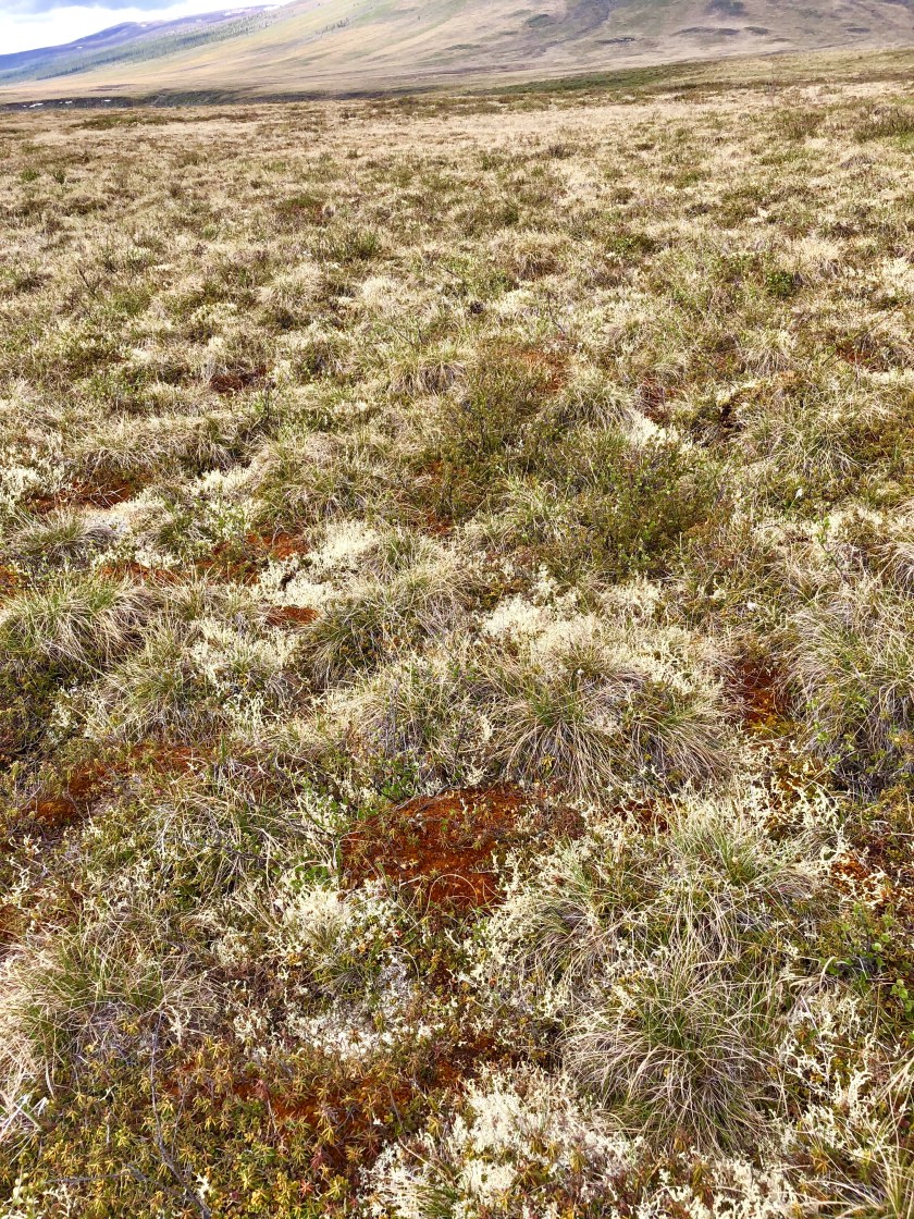 The Tundra was surprisingly hard to walk on, what looks like smooth solid ground is actually soft , spongey and often wet . Because of the permafrost just below the surface, water can’t drain away, resulting in a sort of continuous swampy ground. About every 10 paces I would sink into ankle deep hidden puddles . Fortunately I had my rubber boots on.