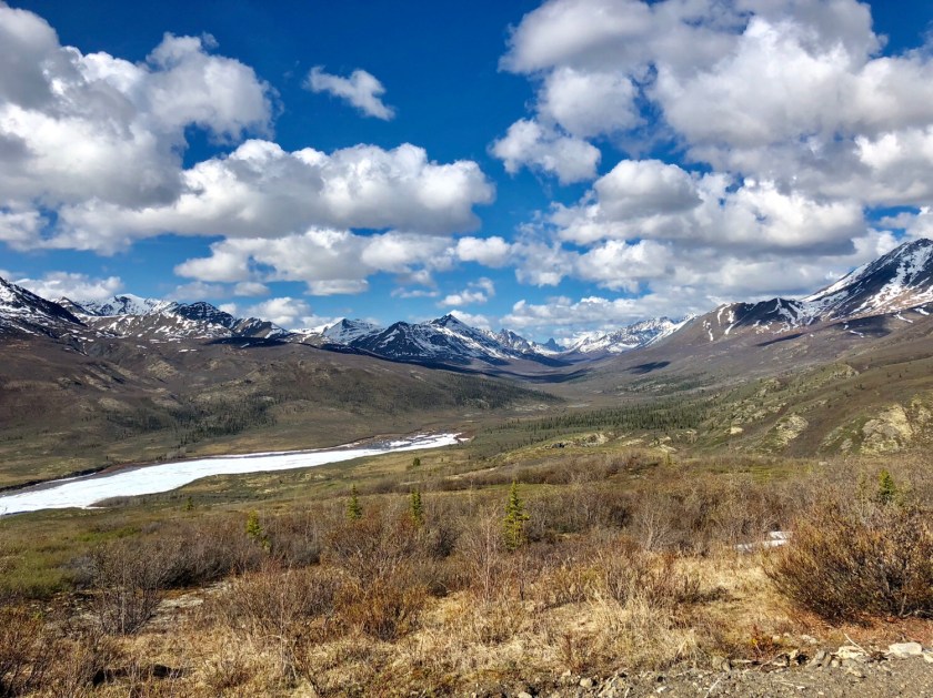 I camped by a rushing glacial fed river close to the road. Although I carry my own drinking water, camping by a river provides access for washing, etc. Normally I avoid camping near a road, but in this case, the sound of that one vehicle every hour or two was a comforting sound of fellow humans in this vast wilderness.