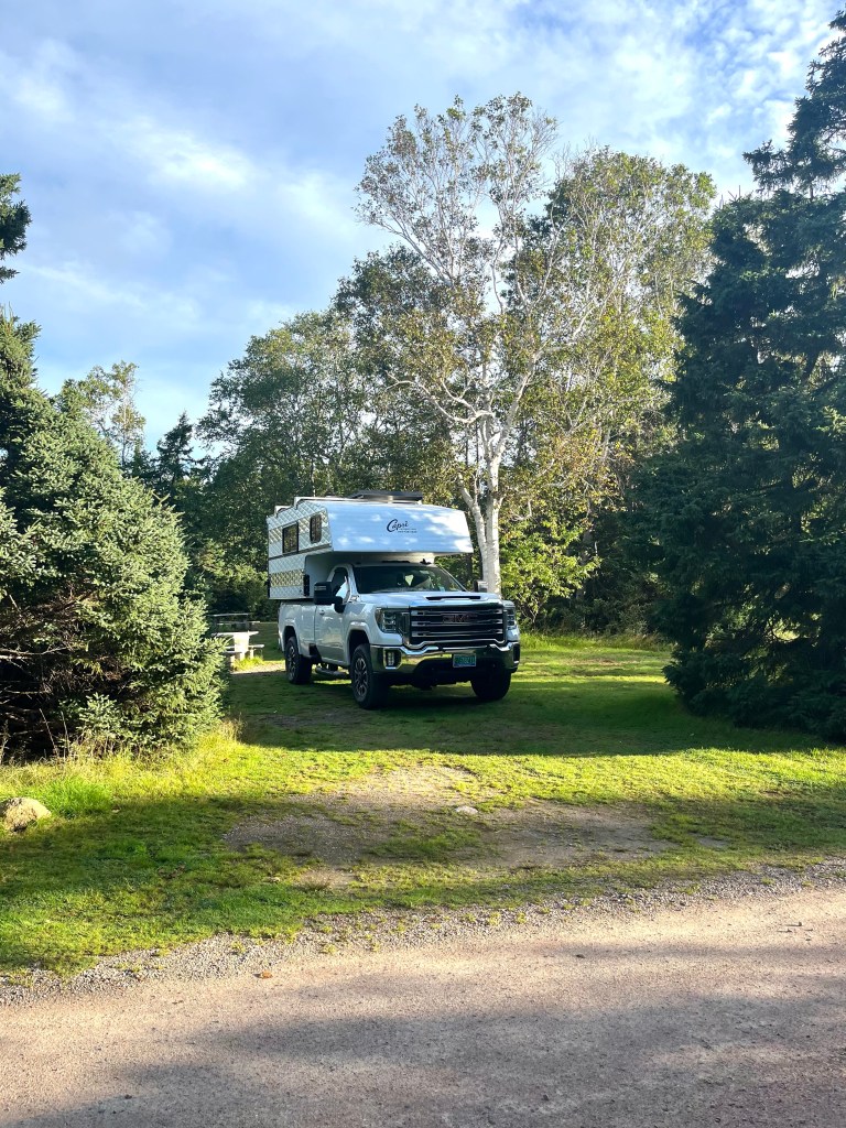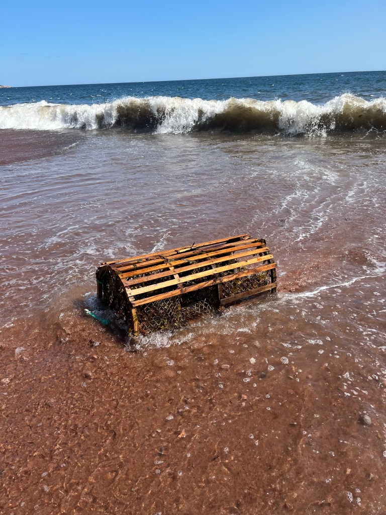 We are staying on the very Northern tip of Nova Scotia at Cape Breton National Park. Our private site is only a couple hundred yards from the beach which goes on forever and is empty, we have it to ourselves. Abandoned lobster traps are sprinkled on the beach, one looked active wallowing in the surf so I dragged it up in the beach, empty. I went swimming in the surf today, so much like CapeCod and Nantucket. The National Park campgrounds are fully booked but still seems quiet here. Canadians are very friendly and polite. There is zero trash anywhere, roadsides, beaches, campgrounds. Canadians don’t litter.