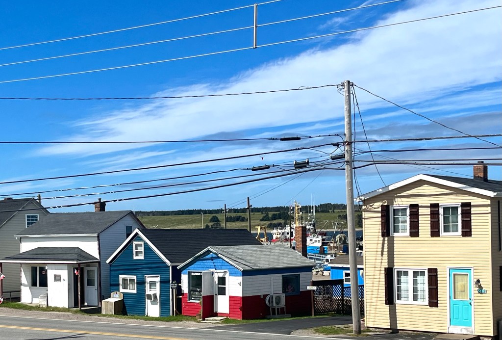 We stopped for lunch at Cheticamp ( pronounced shittycamp ) .The village is known for its Snow Crab, we had crab rolls. Notice the wind wall attached to the left side of the barbershop door to shield it from from the open ocean winds. The fishing fleet is in the harbor in back.
