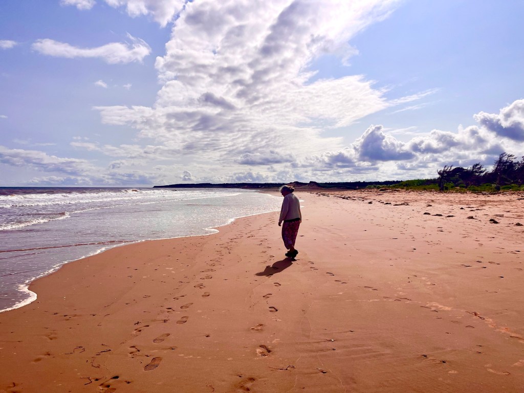 We are staying in a beautiful National Park camping 100 ft from the beach pictured. A strong storm blew through yesterday, the sound of the roaring surf woke me up several times last night. The sun came out today and we wandered down this empty beach enjoying the mild weather. Tomorrow we head to the opposite end of PEI staying at another National park. There’s virtually no Americans here. Canadians don’t liter, this island is very neat and the farms and villages are spotless. We are enjoying the wonderful seafood.