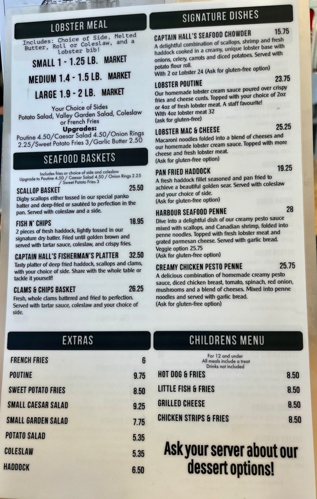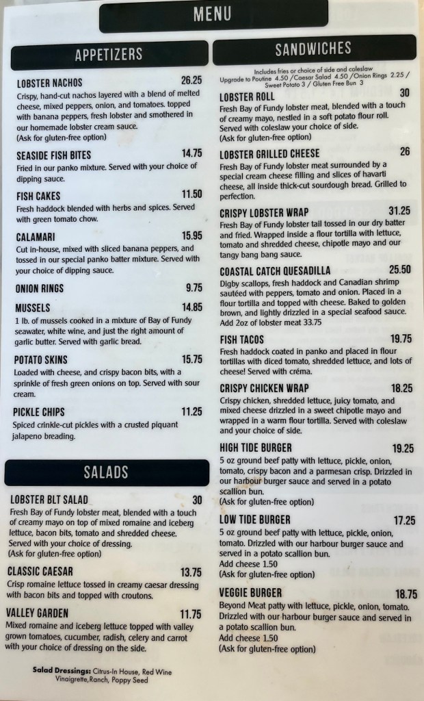 Bay of Fundy waterfront restaurant This restaurant got rave reviews, they erected right. This is Canadian dollars, we enjoyed a 35% exchange rate discount on these prices I got the Seafood Penne, Karen had fish and chips. Yum ! Share this: Click to share on X (Opens in new window) X Click to share on Facebook (Opens in new window) Facebook Like Loading... Related