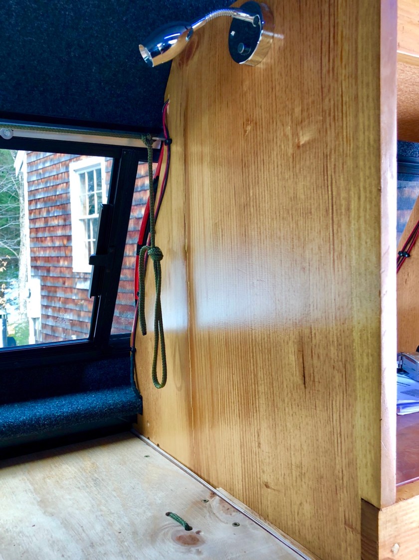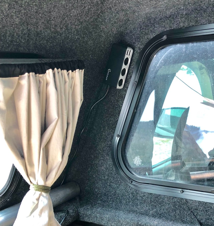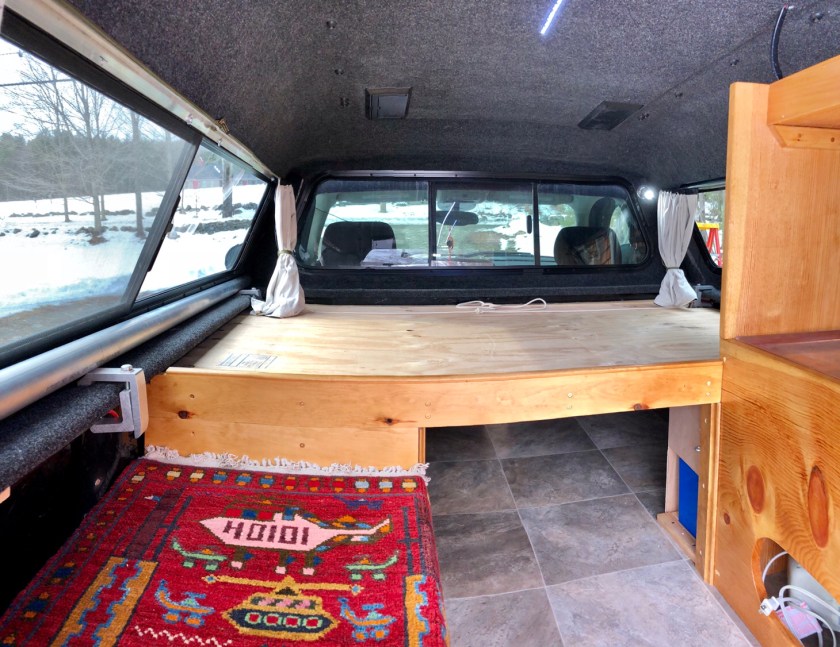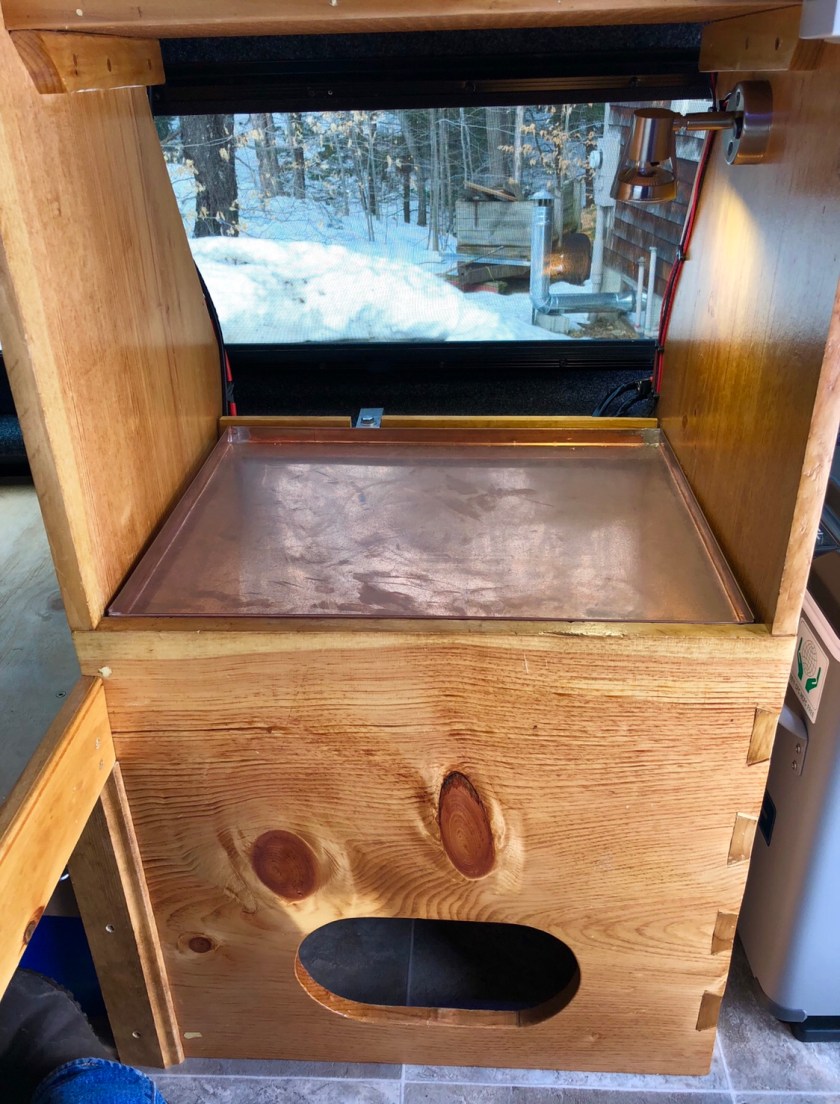 The camper height allows us to sit on the bench without hunching over. The ” kitchen ” has a naturally antibacterial copper countertop with storage below. Our bed has a custom made mattress to assure a decent night sleep. Curtains will give us some privacy. Fans, goose neck LED lights for reading, and wireless speakers will make the small space more livable although we realize the whole adventure will have a big learning curve. We depart in a week